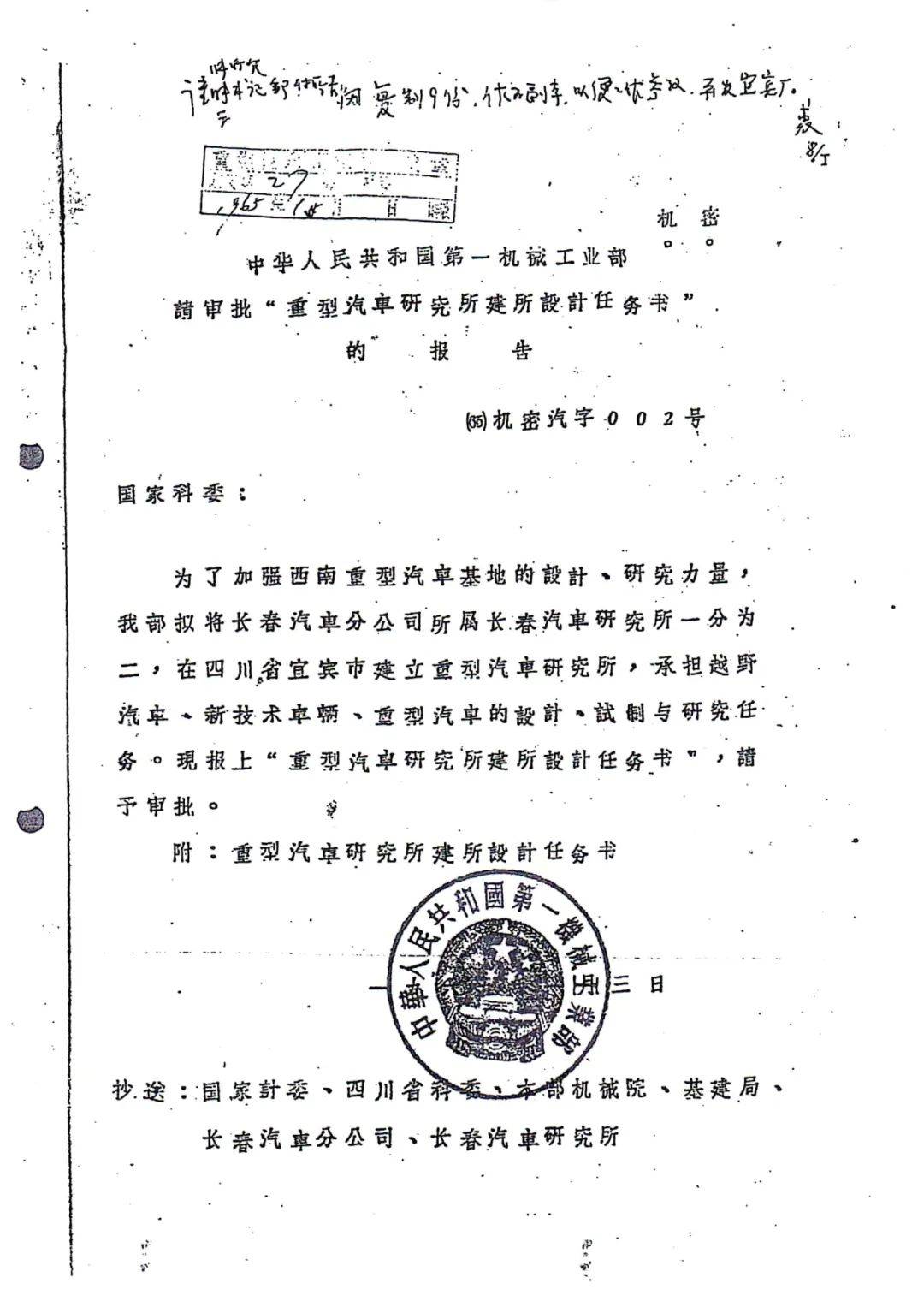 1965年初,为支援三线建设,一机部决定将长春研究所重型汽车部分调到四川宜宾,组建重型汽车研究所,就是后来的重庆重型汽车研究所,它最早是为引进贝利埃汽车技术,为国家开发重型车。